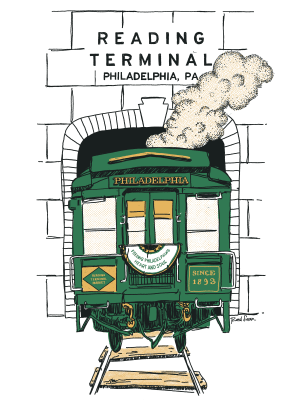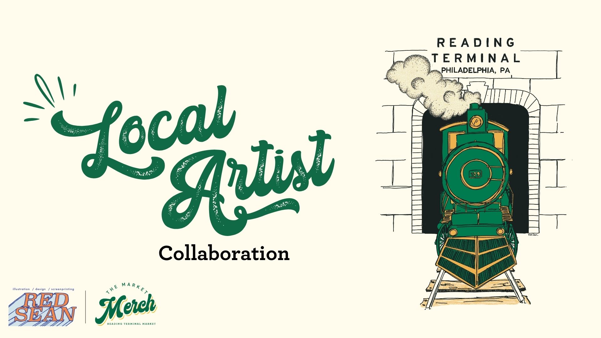 Reading Terminal Market has partnered with Sean Rynkewicz, also known as “Red Sean”. This Philadelphia based editorial illustrator, designer, teacher, and screen printer is also an Assistant Adjunct Professor in the Illustration Department at University of the Arts. In his first collaboration with the Market “Red Sean” has illustrated one of the historic Reading Lines locomotives. This limited edition signed illustration will be available on select apparel and gift items.